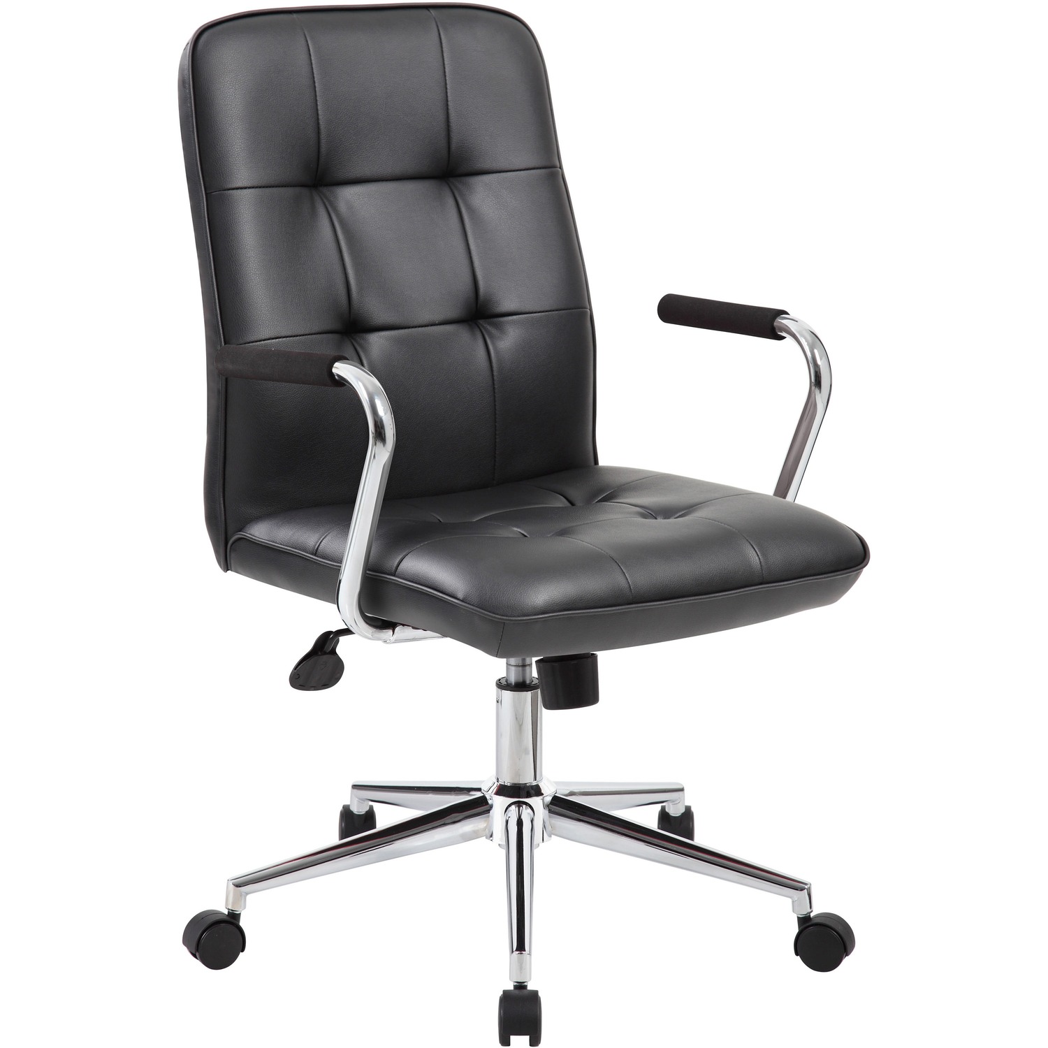 Modern task chair is upholstered with CaressoftPlus to offer an ultra-soft seat that looks and feels like leather yet cleans easily with just a damp cloth. It's also durable and breathable to stay strong through everyday use while helping you stay comfortable. Its high crown chrome base provides enhanced stability to help prevent tipping. Chrome arms provide elegant and comfortable armrests. Upright locking position provides comfortable back support. Pneumatic gas lift allows easy seat-height adjustments to help you find the personalized sitting style that suits you and your work environment. Adjustable tilt tension control allows you to customize the optimal angle at which you sit. Hooded, double-wheel casters make it easy to move and shift directions. Task chair supports up to 275 lb.