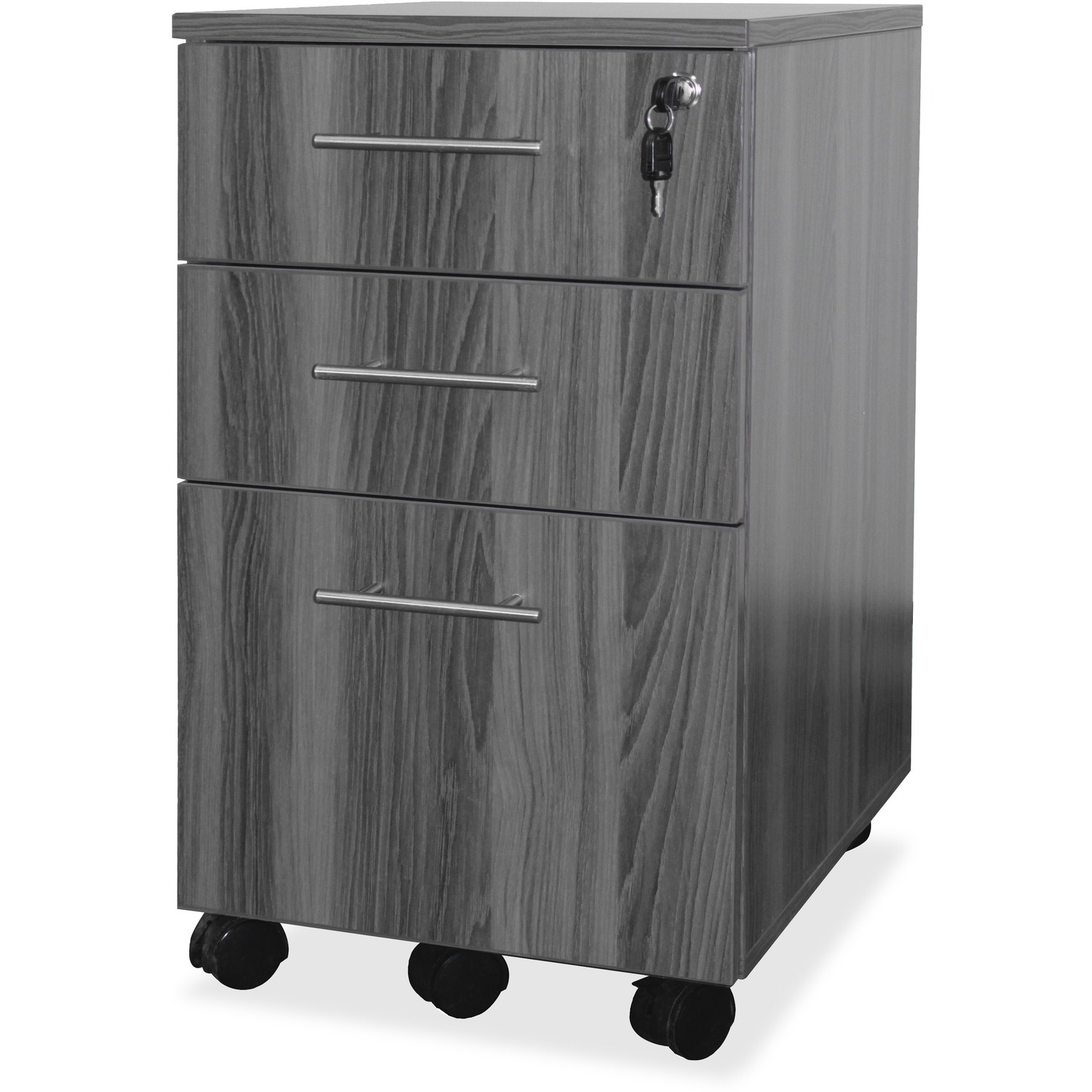 Pedestal is part of the Mayline Medina Series with contemporary style and elegant functionality. Clean lines, curved shapes and floating worksurfaces reflect Italian design influences. Gray Steel laminate finish ensures a beautiful collaboration with other Mayline furniture and complements most any decor. Laminate is stain-resistant, water-resistant and abrasion-resistant. Both box drawers and the file drawer operate smoothly using full-extension, ball-bearing suspension. File drawer accommodates both letter-size and legal-size file folders with included hangrails. Durable pedestal fits under credenzas and rolls smoothly on 2" dual-hooded casters. Ganglock features a removable core for locking all three drawers. Finished top surface offers another surface for storage when you situate the pedestal next to your desk.
